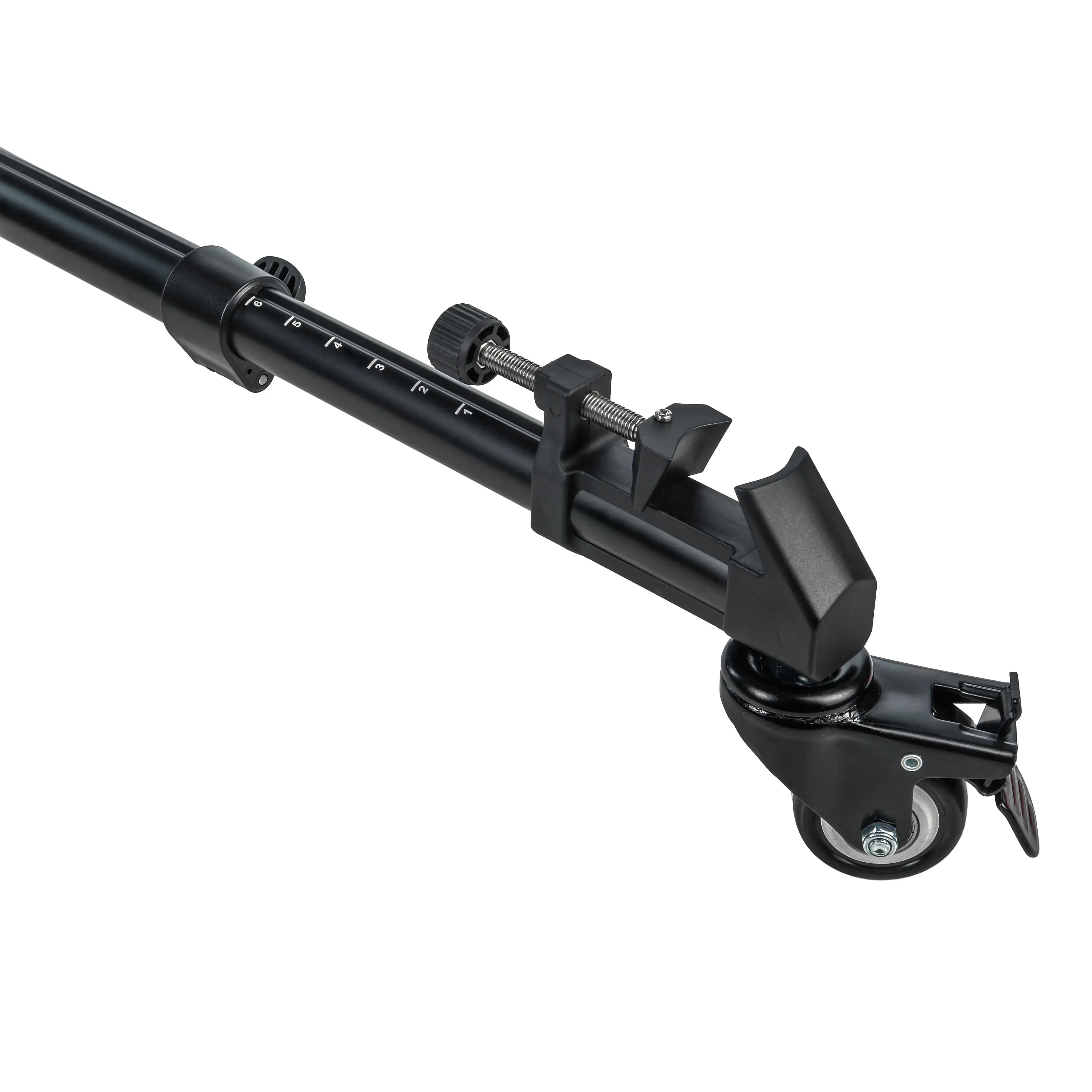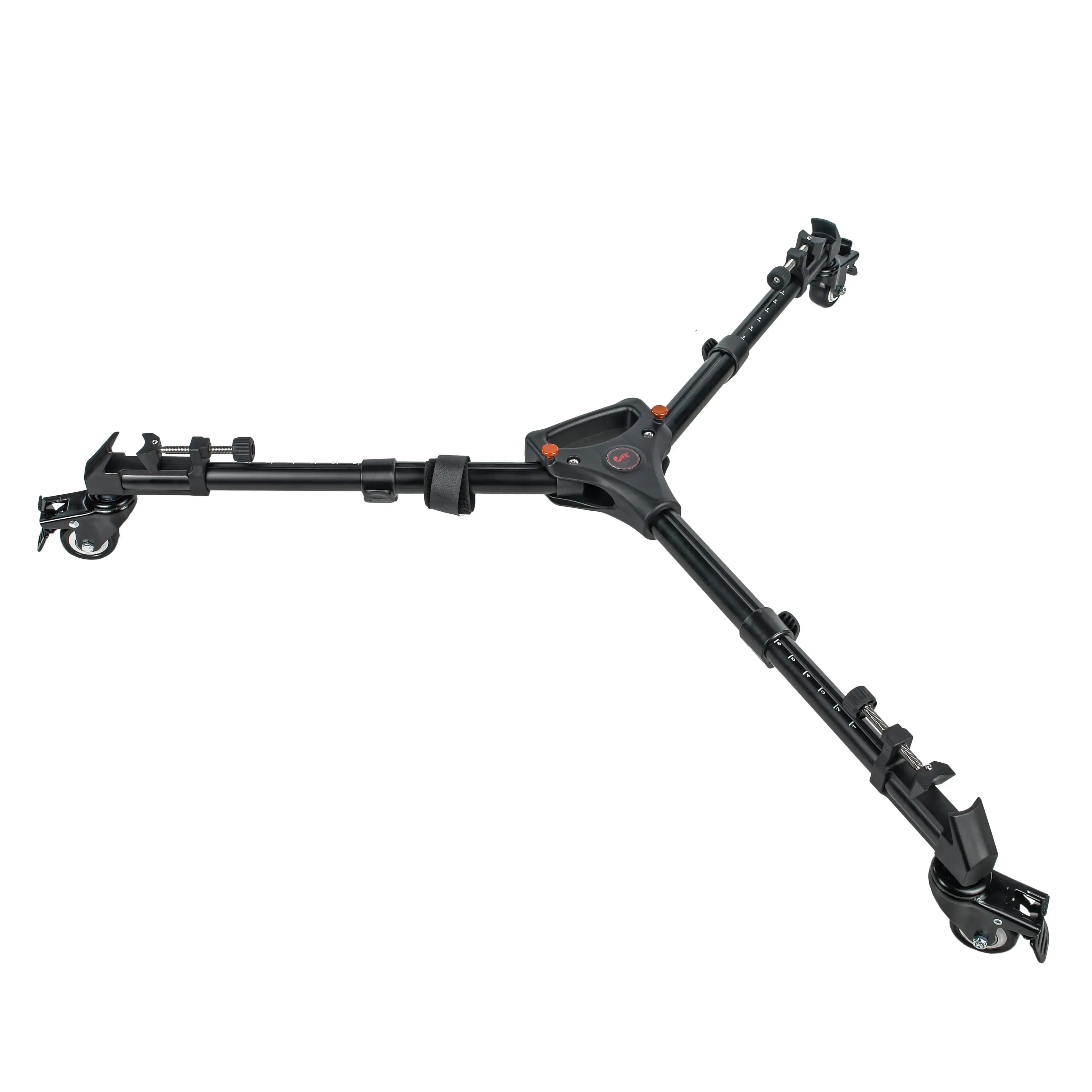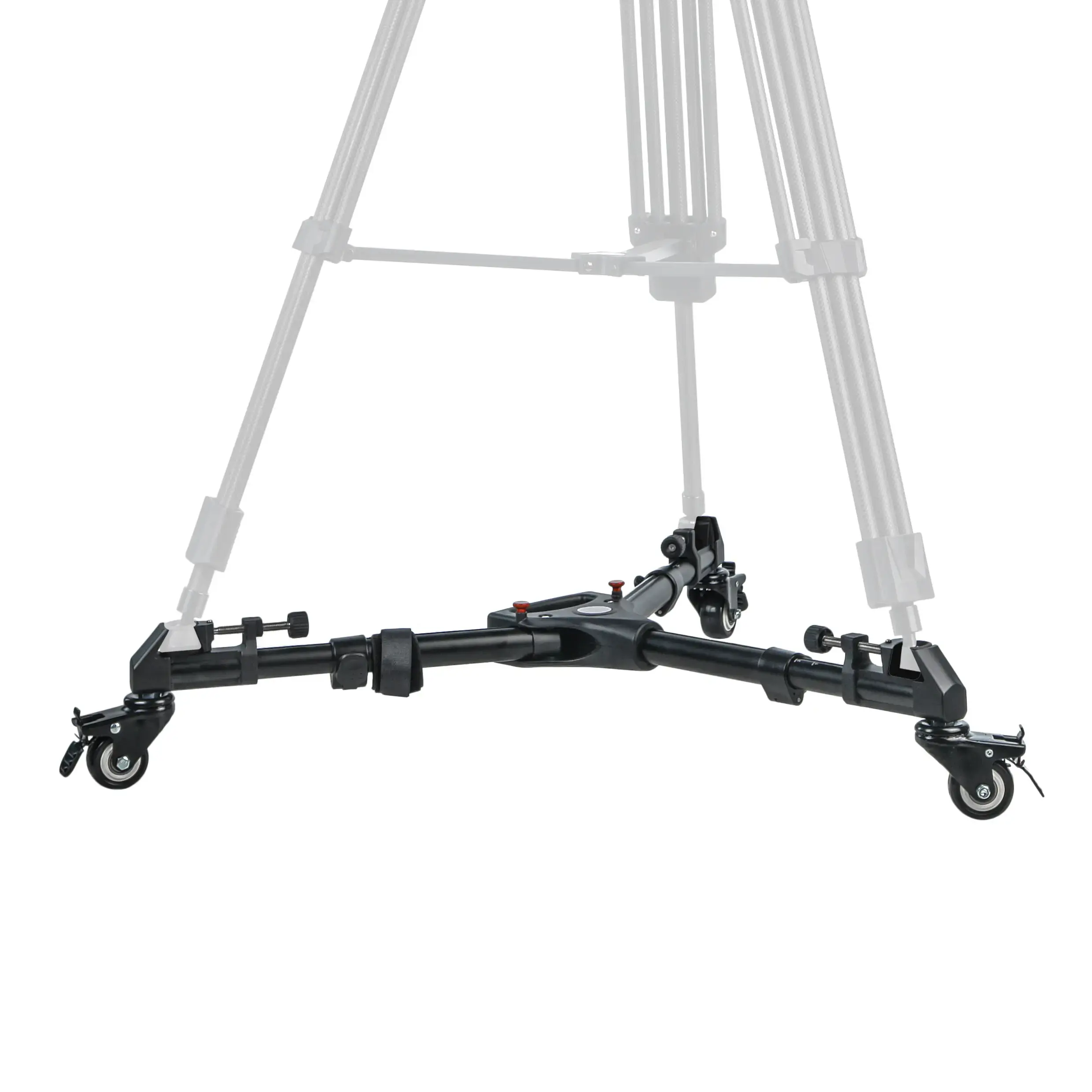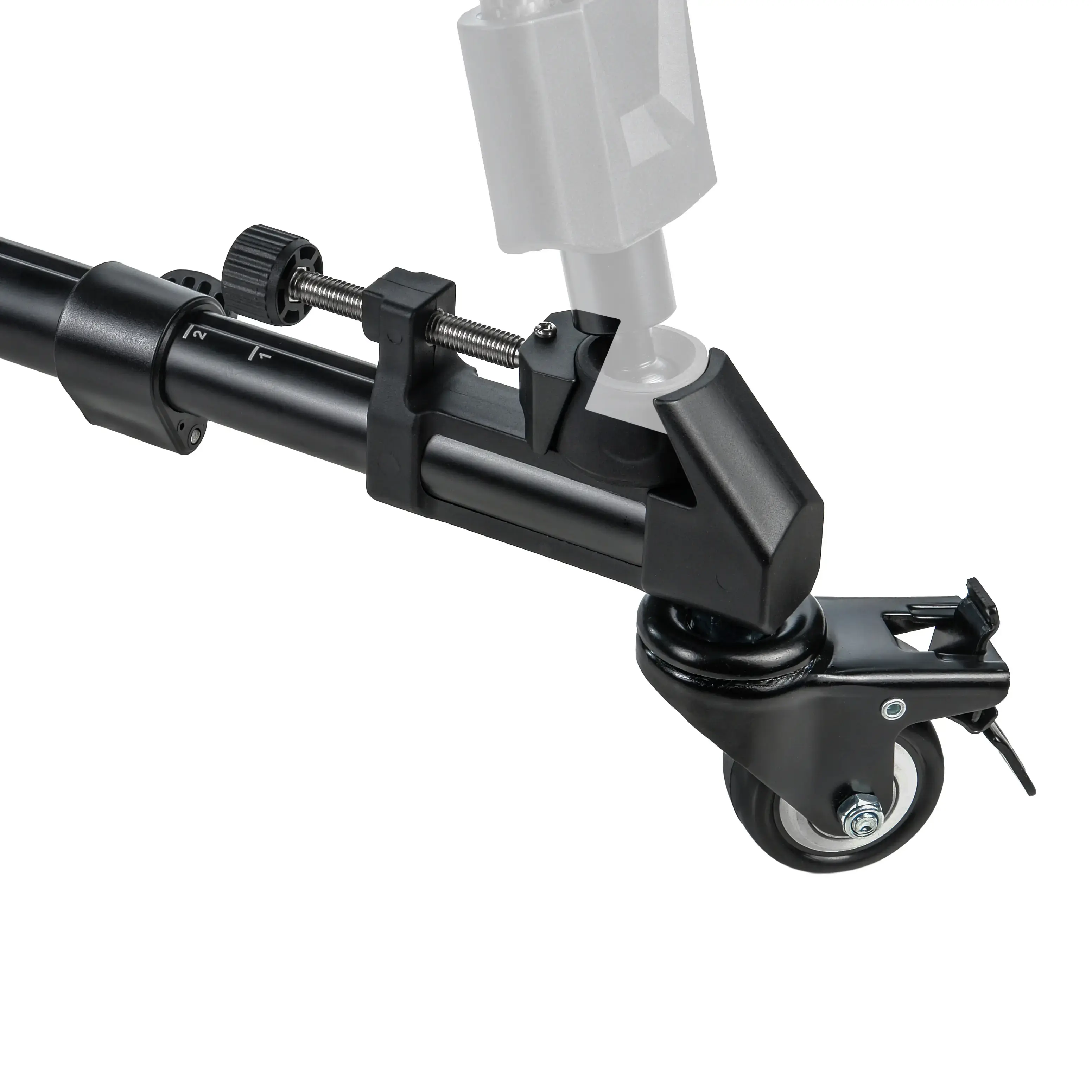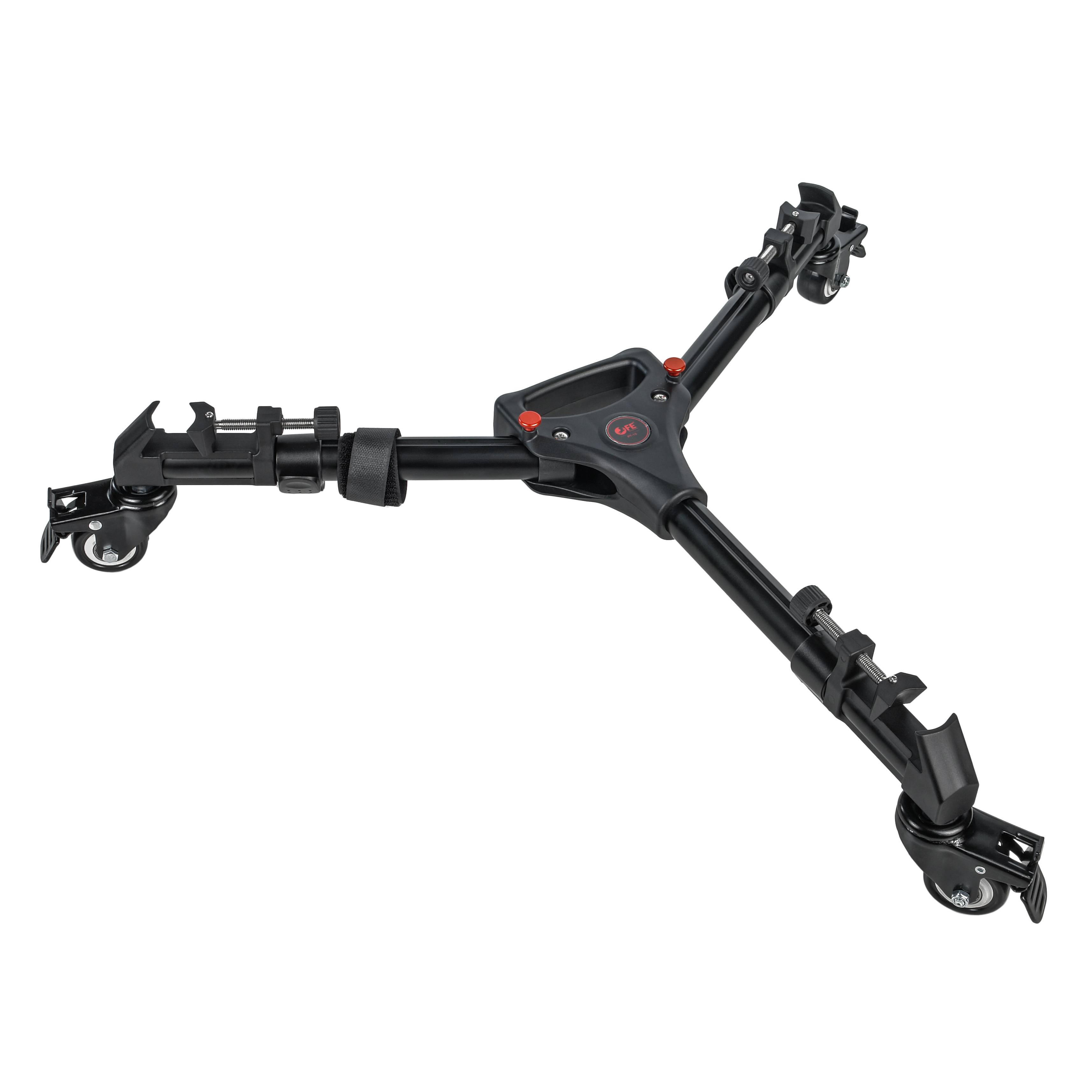 Три резиновых колеса диаметром 50 мм гарантируют плавный и бесшумный ход, что особенно важно при видеосъемке. Благодаря повороту колес на 360 градусов тележка обладает высокой маневренностью в ограниченном пространстве. На каждом колесе установлен индивидуальный тормоз для надежной фиксации во время работы.