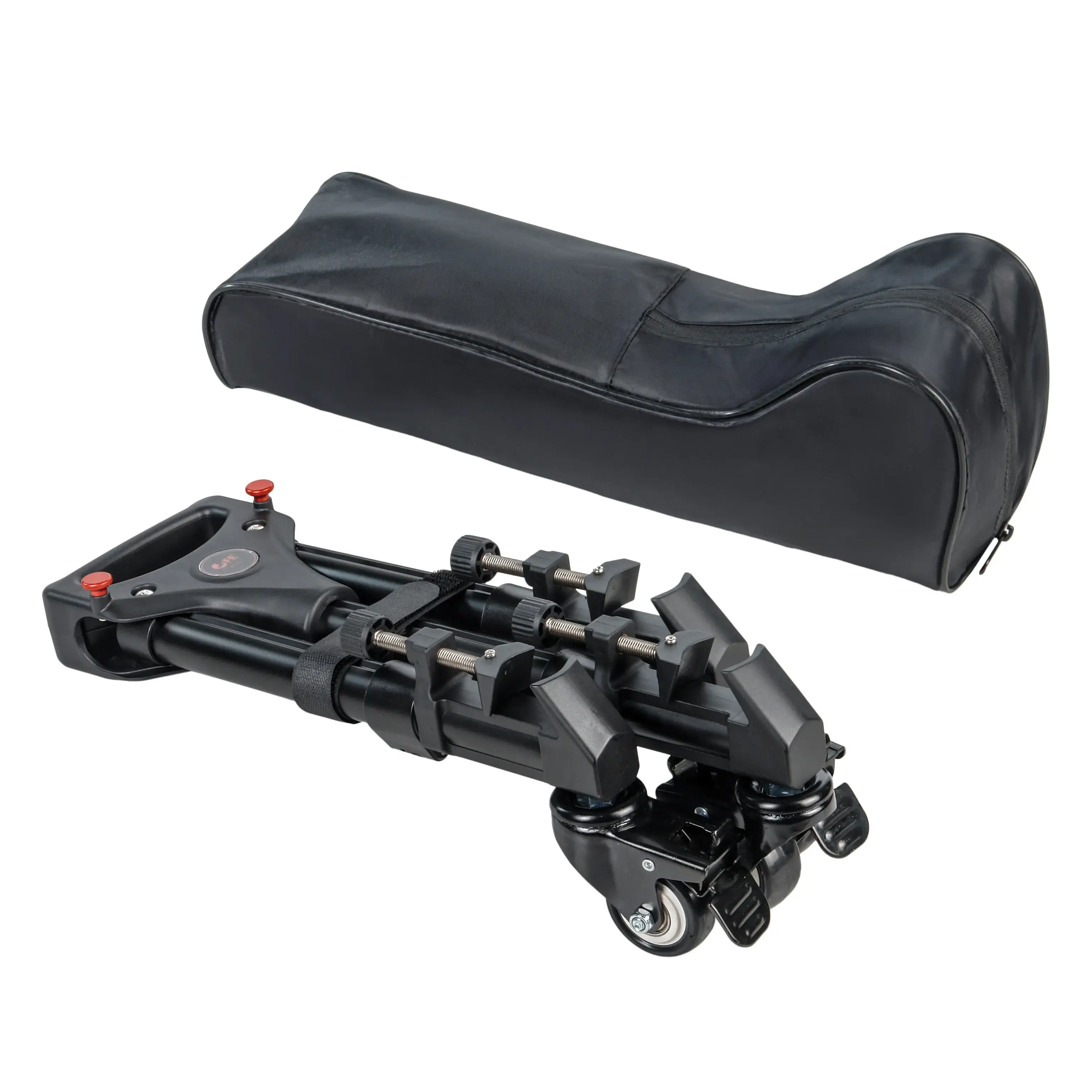 Основу тележки составляет каркас из легкого алюминиевого сплава, что обеспечивает высокую прочность при малом весе (1,75 кг). Прочные пластиковые элементы в менее нагруженных узлах и резиновые колеса делают конструкцию практичной, не добавляя лишней нагрузки при транспортировке оборудования.
