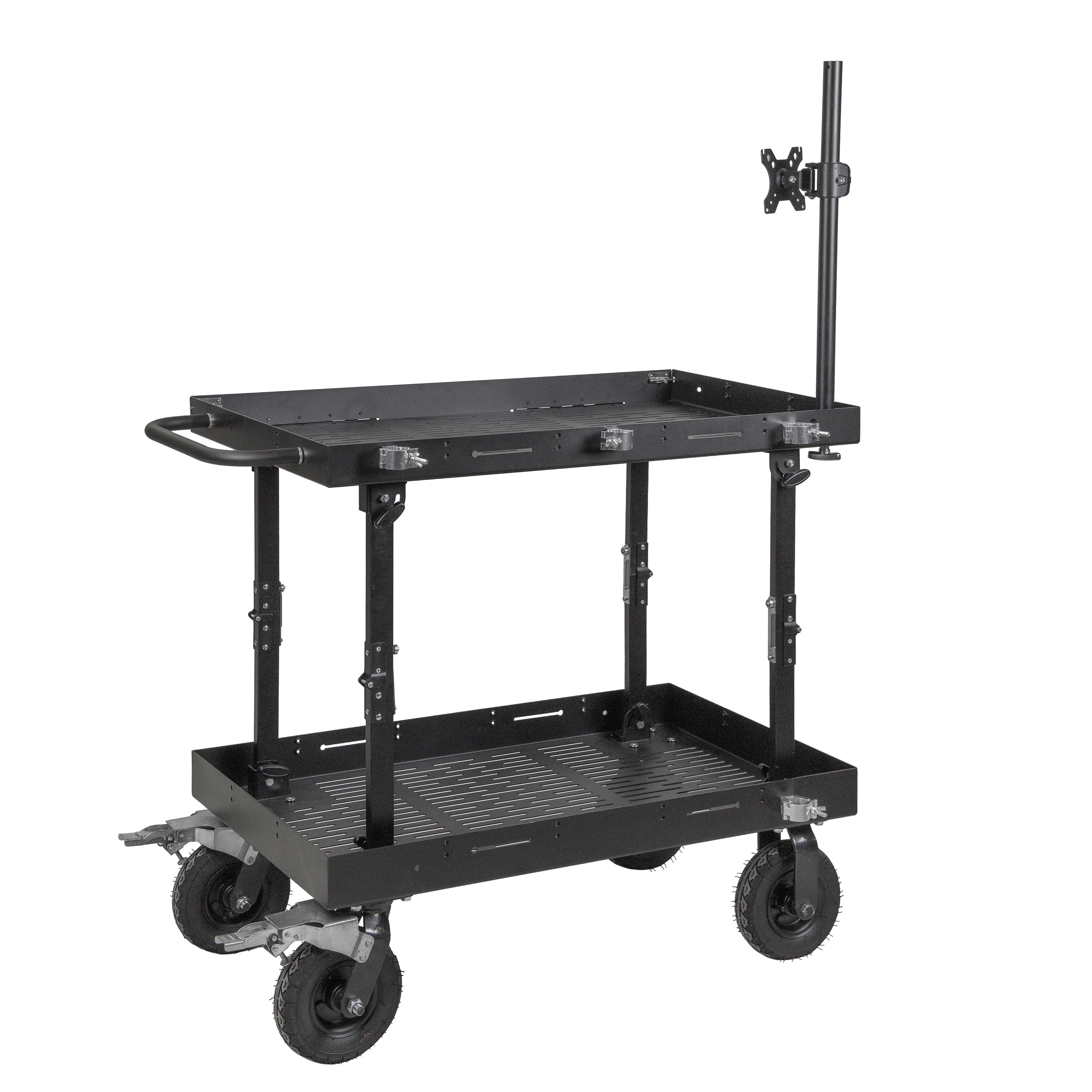 Комплектация тележки включает дополнительную стойку длиной 67 см с регулируемым держателем для установки монитора или специализированных аксессуаров. Четыре зажима для труб, размещаемые вдоль бортов, предназначены для крепления вспомогательных аксессуаров. Эти элементы позволяют адаптировать конфигурацию тележки под конкретные производственные задачи, создавая мобильную рабочую станцию для различных сценариев съемки.