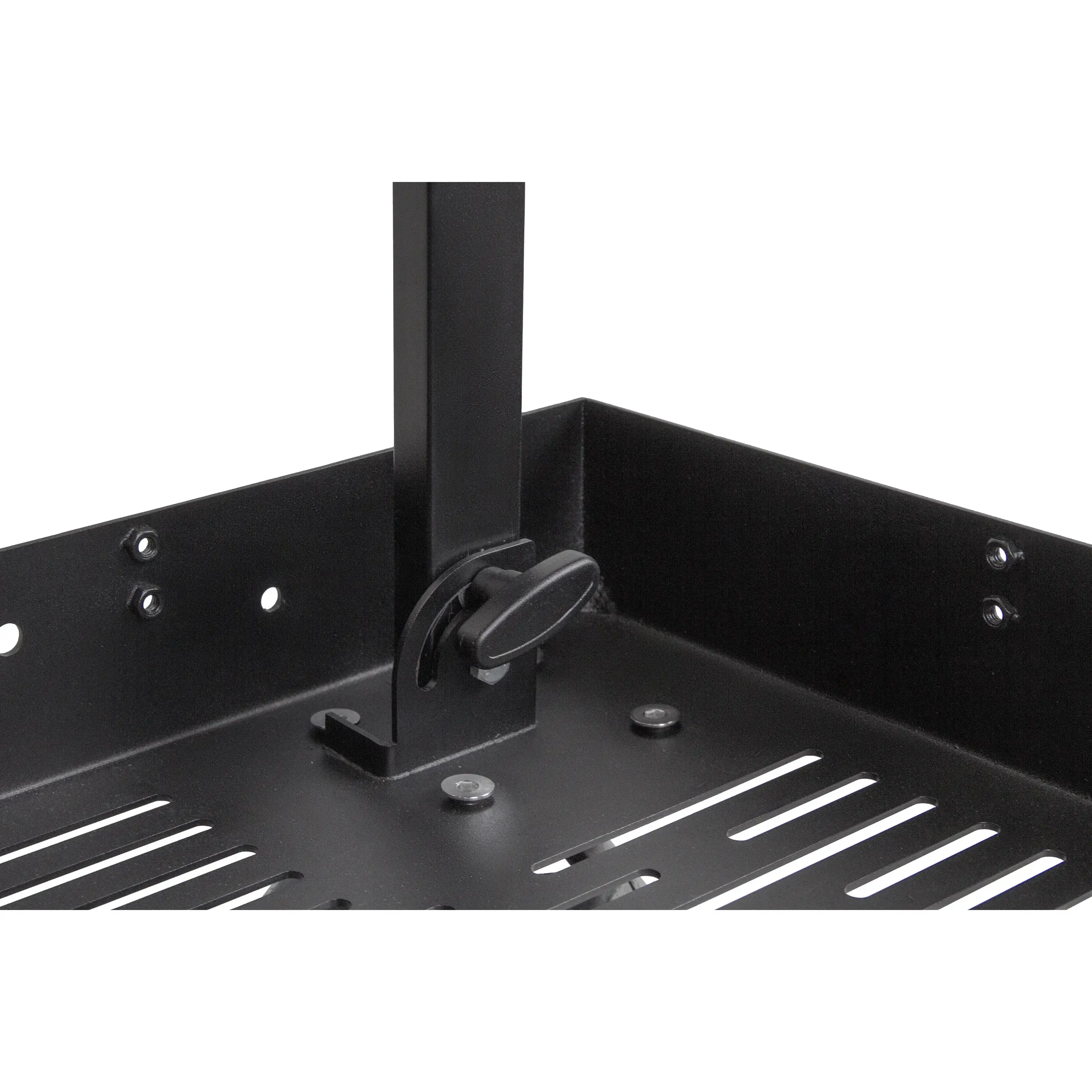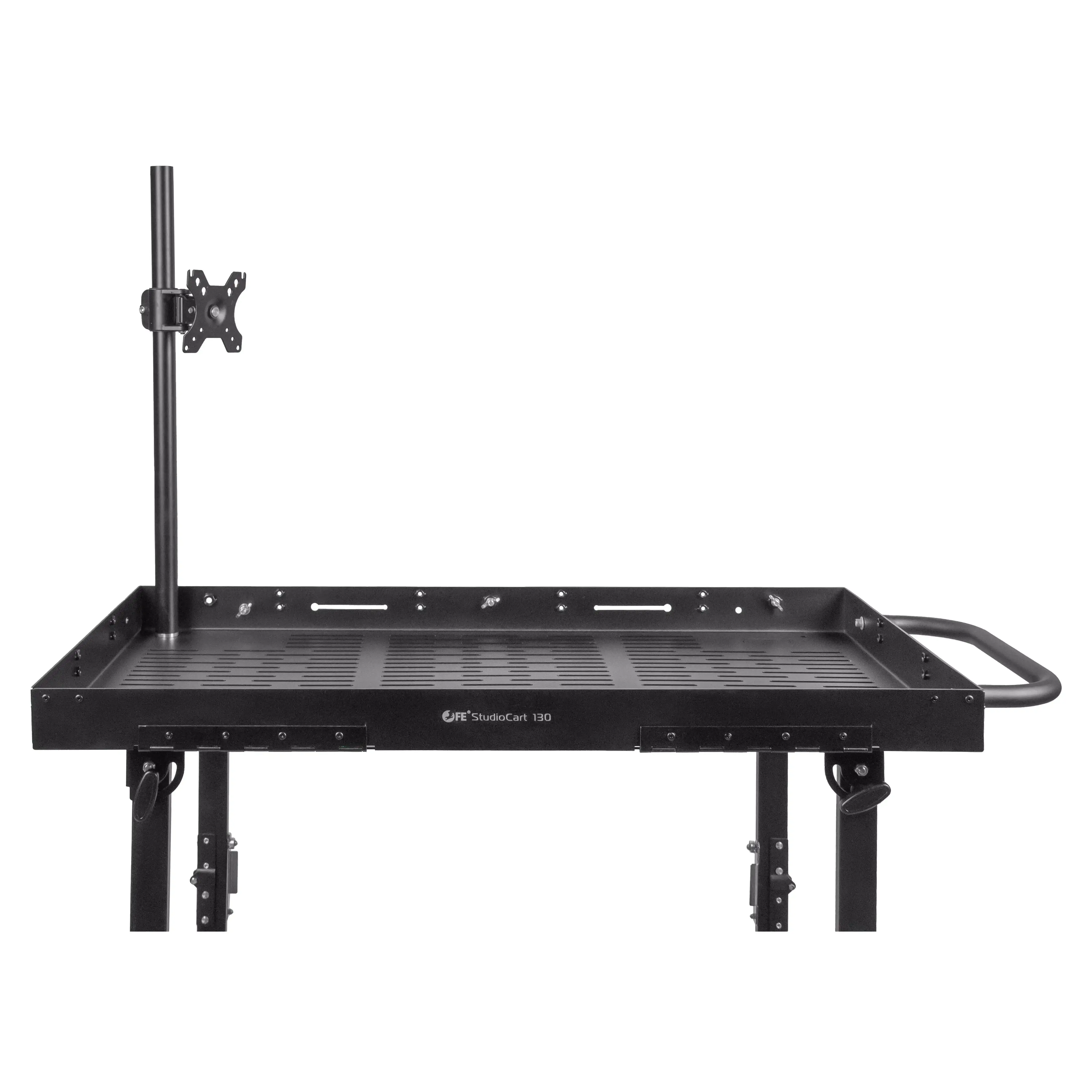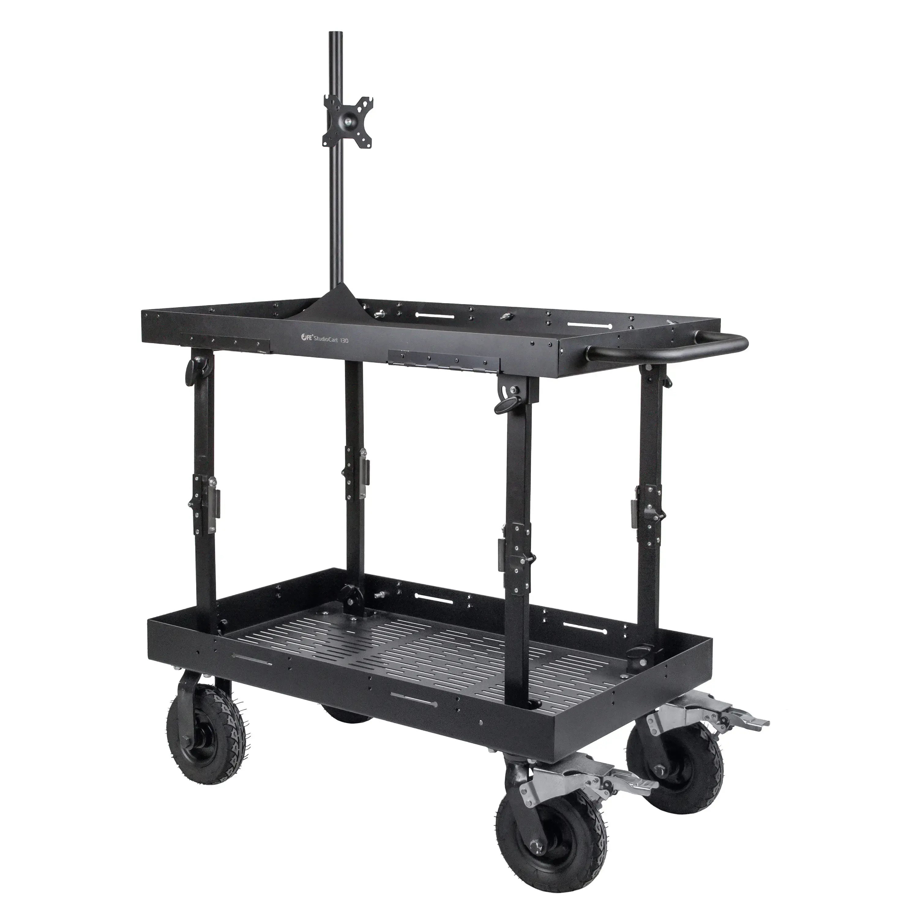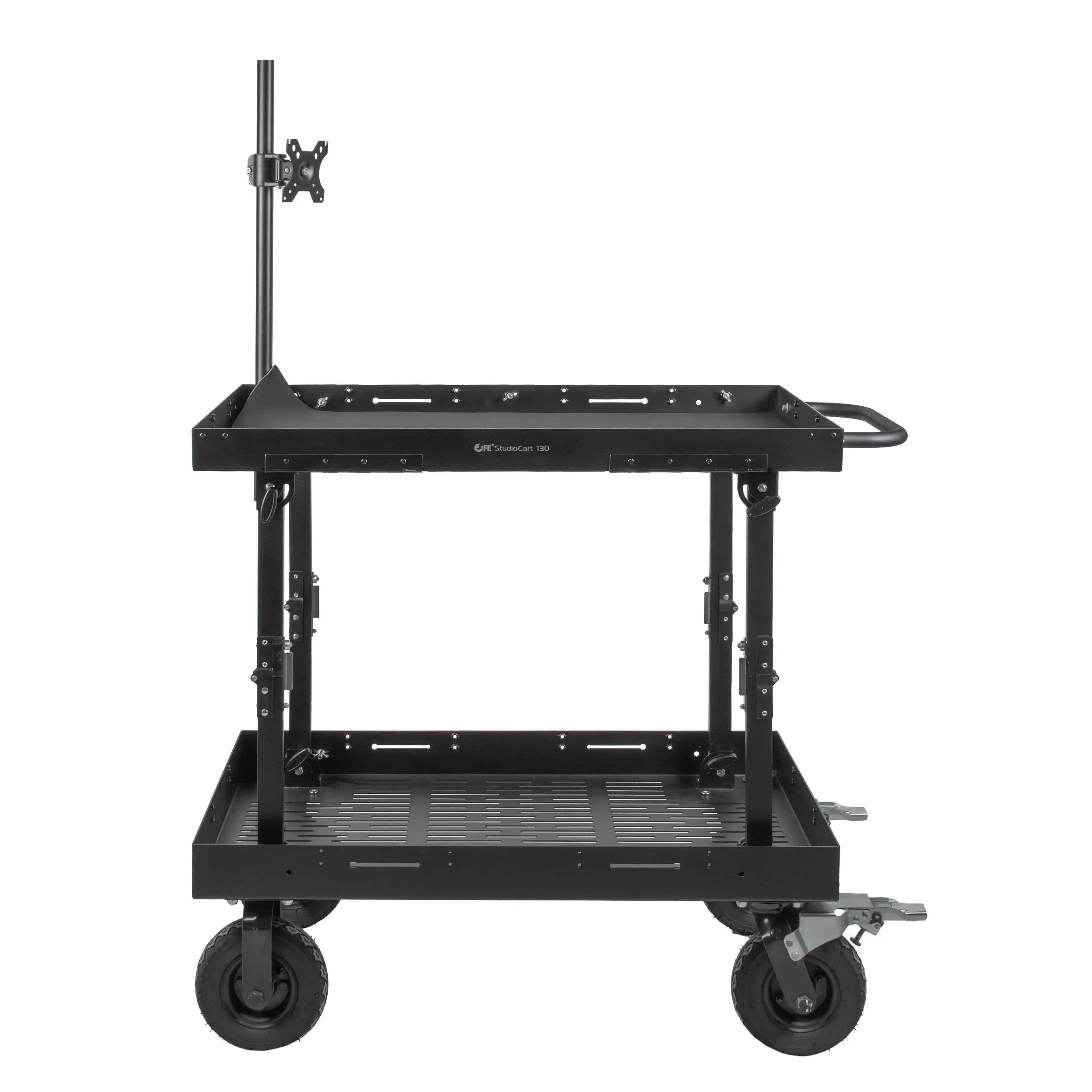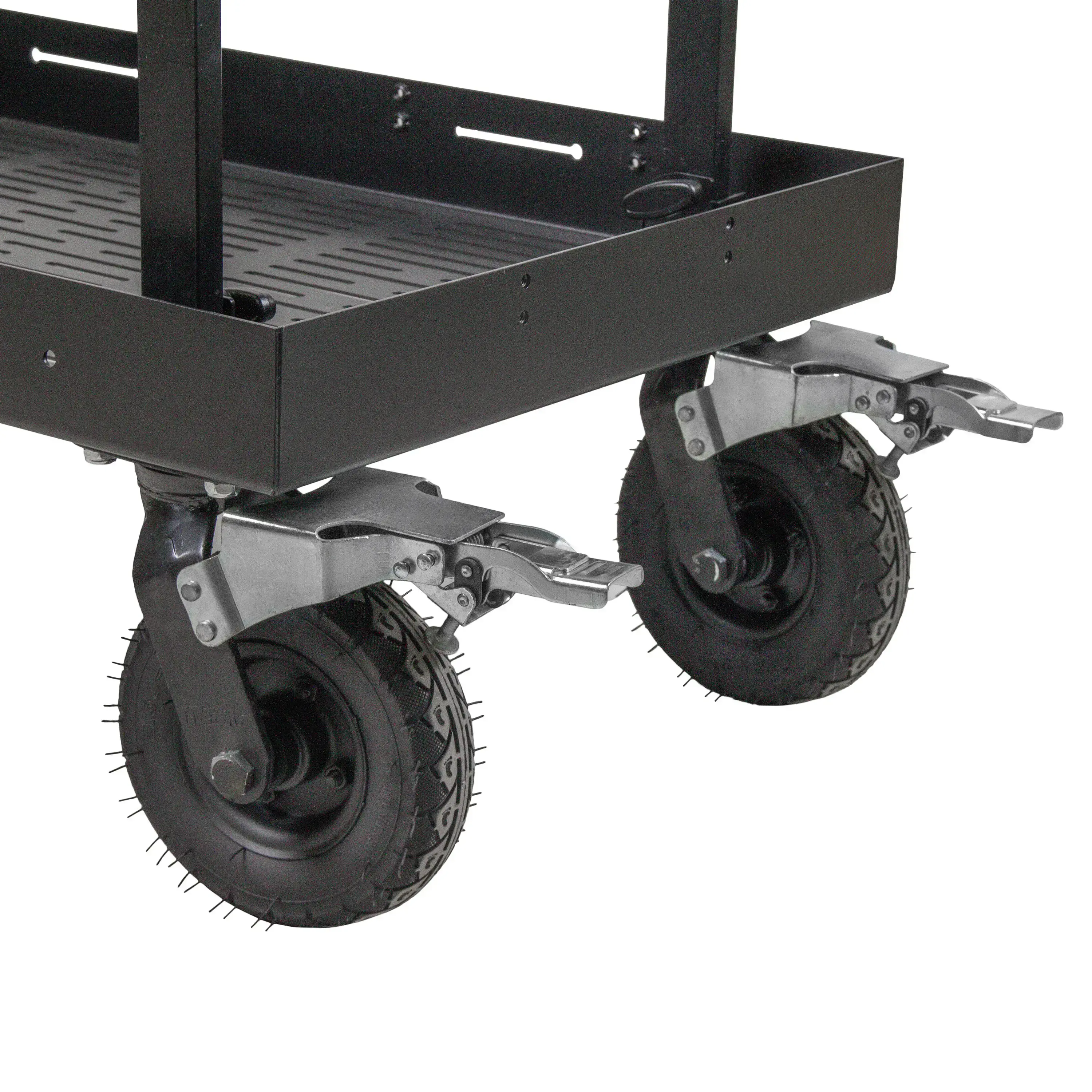 Тележка оснащена двумя полками габаритами 60x100 см с противоскользящими ковриками, предоставляя пользователю значительную площадь для удобного и безопасного размещения оборудования. Борта полок имеют множество монтажных отверстий, позволяющих операторам индивидуально настраивать систему крепления.