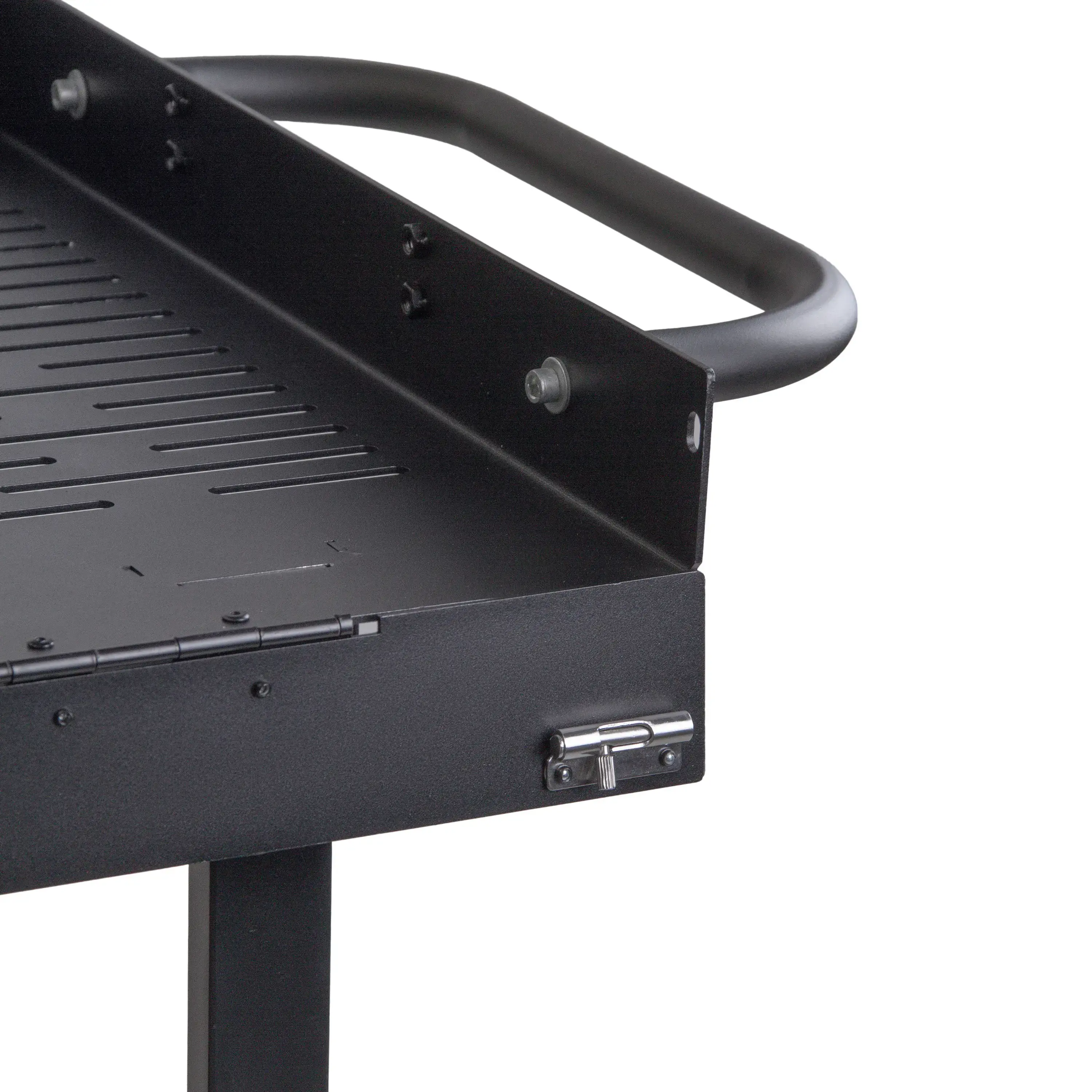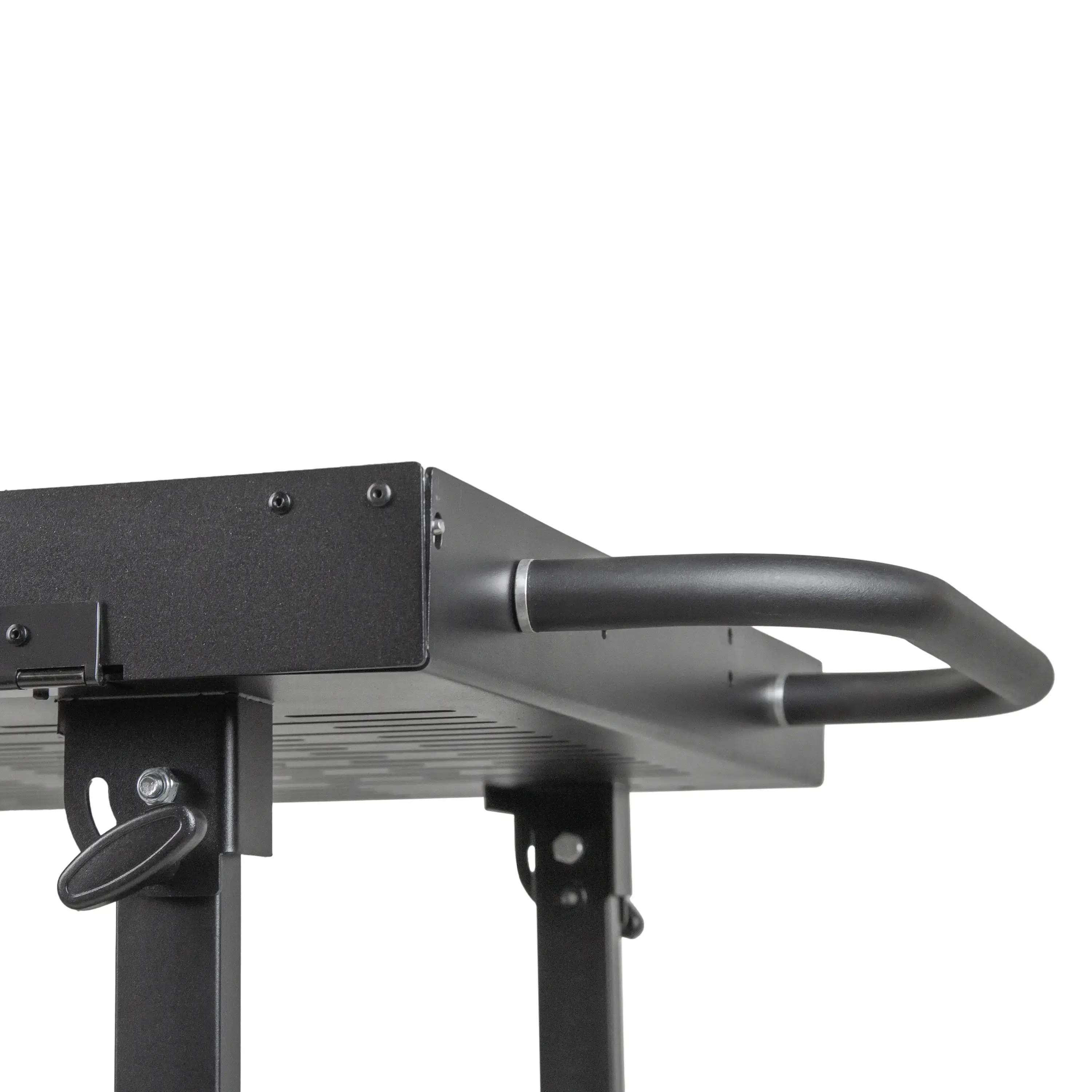 Верхняя полка оборудована откидным бортом на надежных защелках для удобной погрузки и выгрузки оборудования. Расстояние между полками составляет 66 см, что позволяет размещать даже крупногабаритную технику.