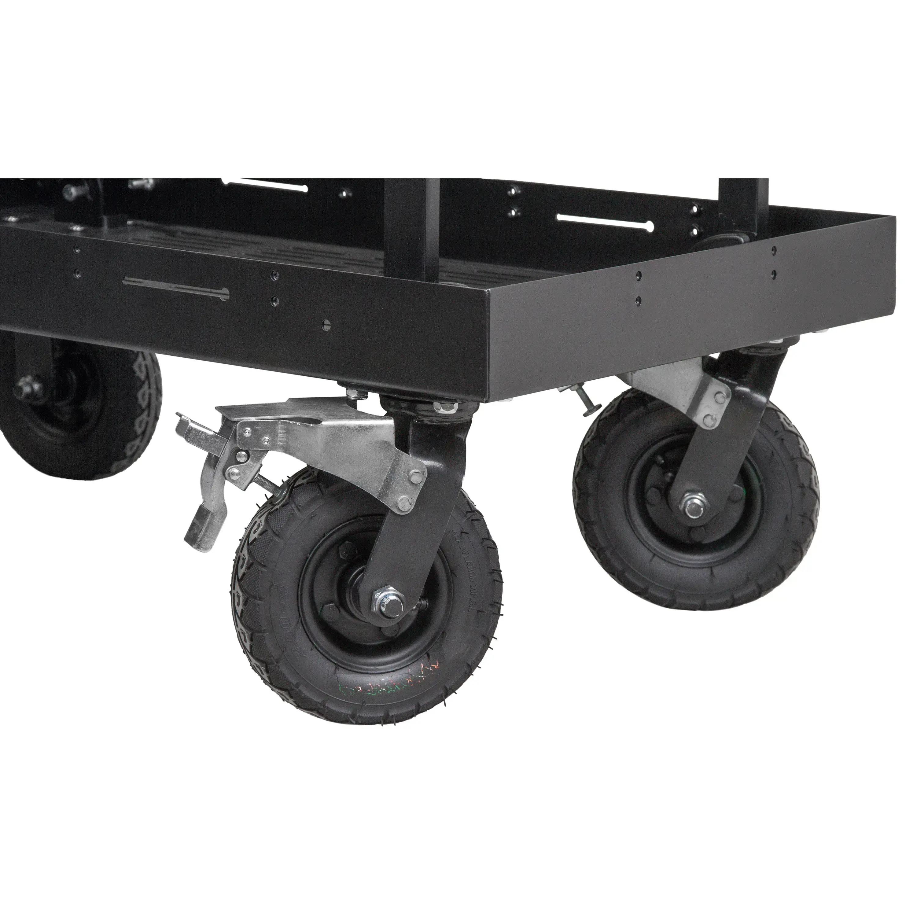 Четыре пневматических колеса диаметром 200 мм обеспечивают плавное перемещение по различным поверхностям. Два колеса оснащены поворотным на 360° механизмом и независимыми тормозами для надежной фиксации тележки во время съемки.