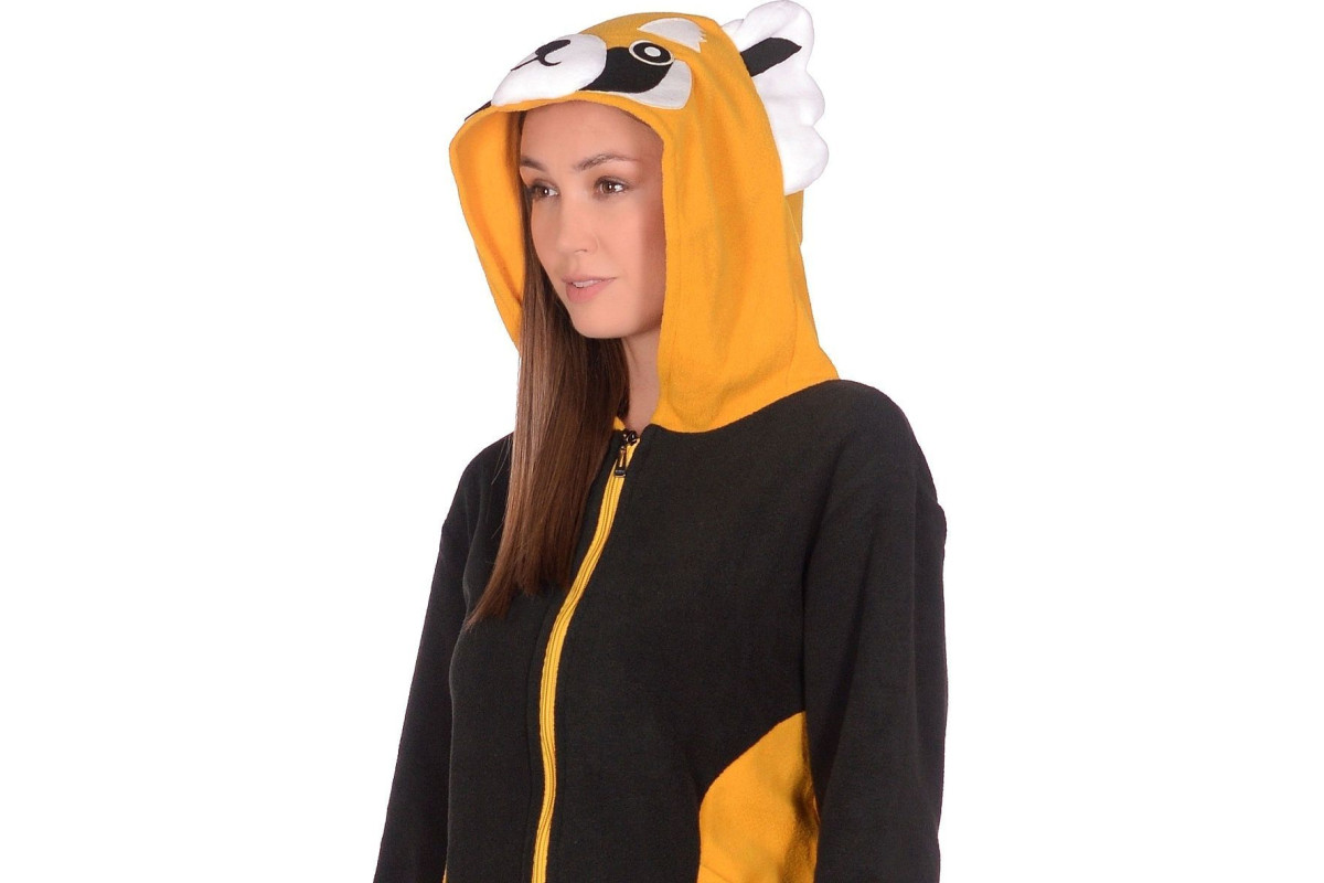 Толстовка Кигуруми Енот очень практична, он создана из велософта, хорошо пропускающего воздух, но способного сохранять тепло. Глубокие карманы спереди позволяют погреть руки в холодную погоду, или сложить туда необходимые вещи. Толстовка спереди на молнии, на рукавах и внизу есть резинка. Капюшон не просто согревает, но и выполнен в форме мордочки енота, что придает изделию большую оригинальность, чем у обыкновенной толстовки.