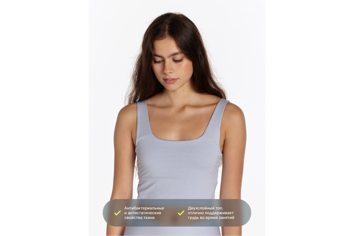 Топ - двухслойный, отлично поддержит грудь во время занятий. Плотная посадка повторяет контуры тела, топ не скручивается во время движений и надежно фиксирует.