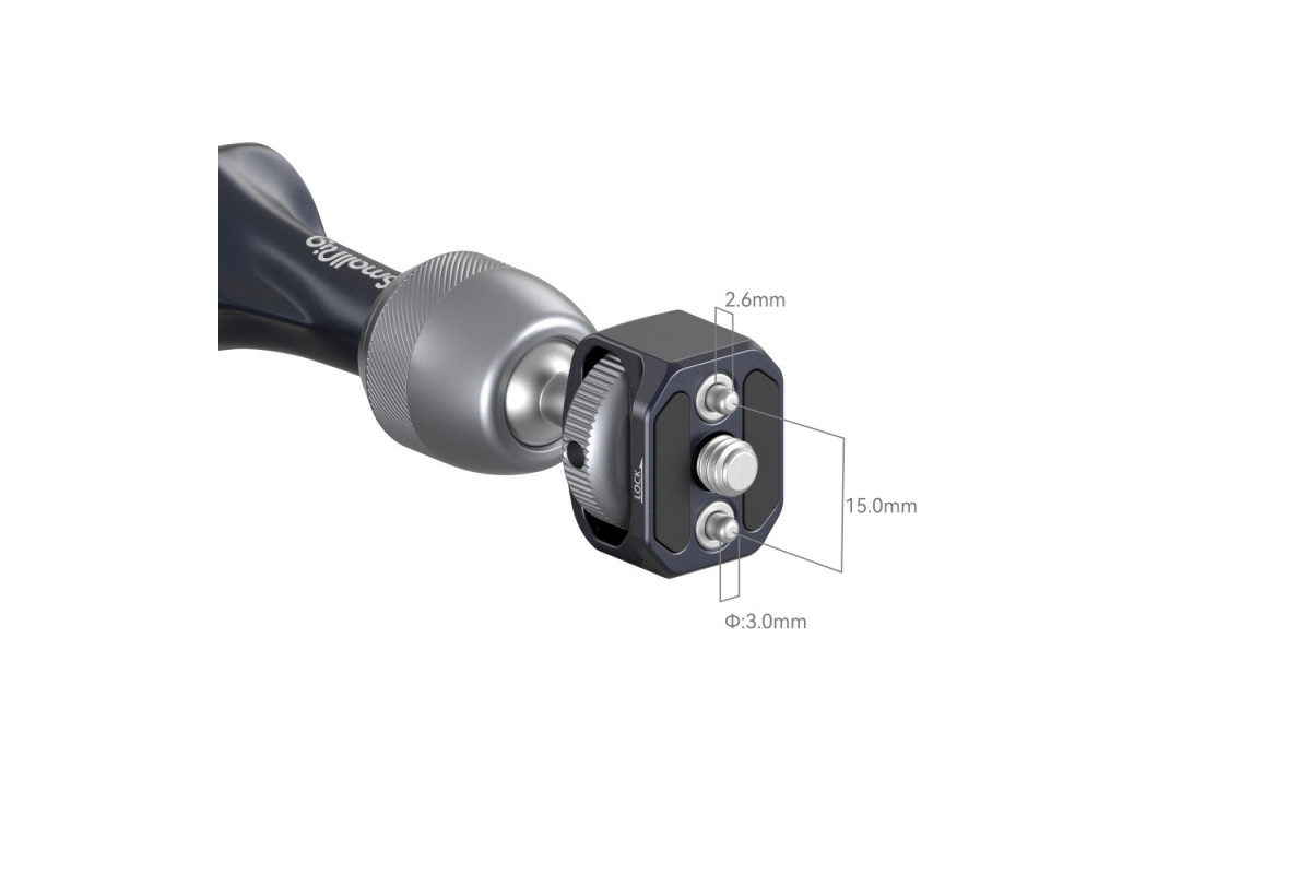 Винт с накатанной головкой помогает зафиксировать аксессуары и имеет отверстия для шестигранного ключа для дальнейшей затяжки; а шаровые головки, регулируемые на 360 градусов, имеют спиральную форму для увеличения трения и выдерживают нагрузку до 3 кг.