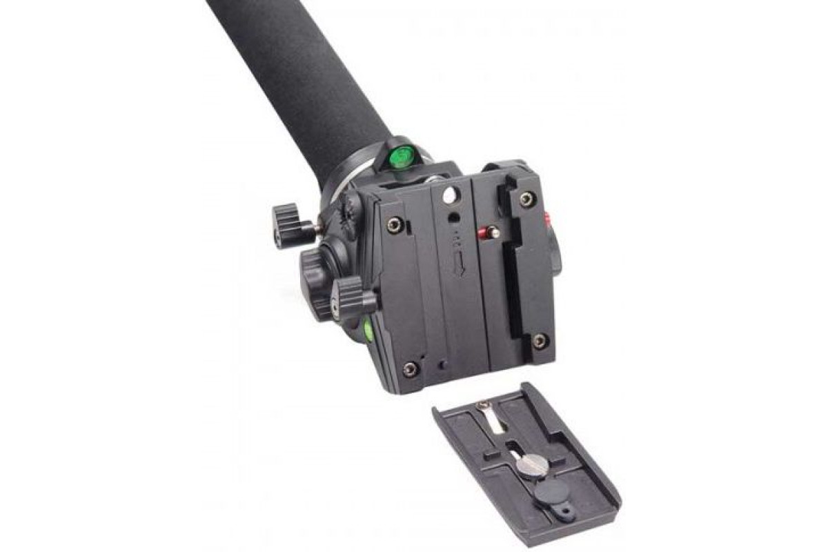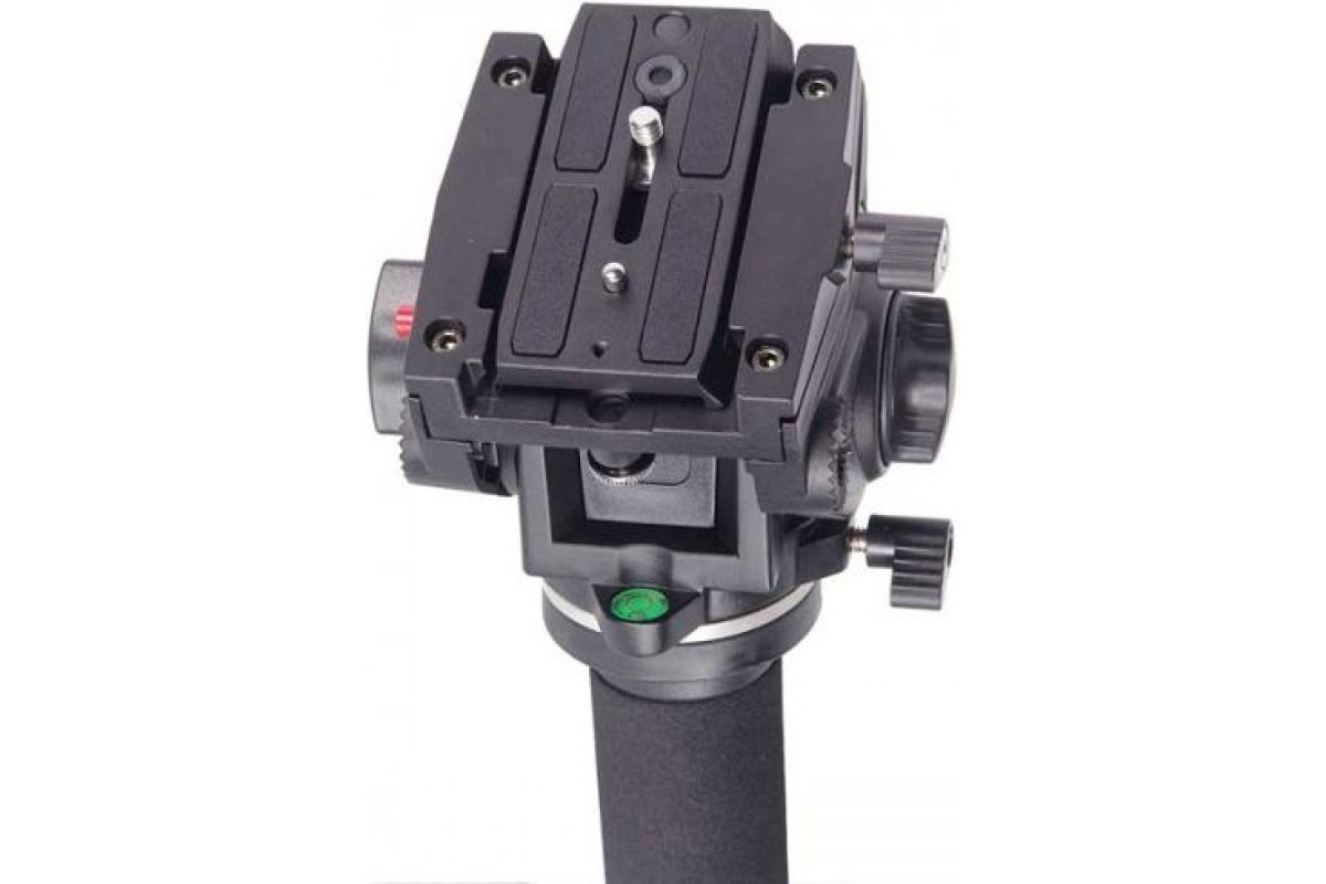 Модель оснащена жидкостной 2D-видеоголовкой с быстросъемной площадкой и рукояткой для управления камерой. Головка крепится на монопод, имеющий в основании поддерживающую шаровую опору с откидными ножками, что дает максимальную свободу управления камерой.
