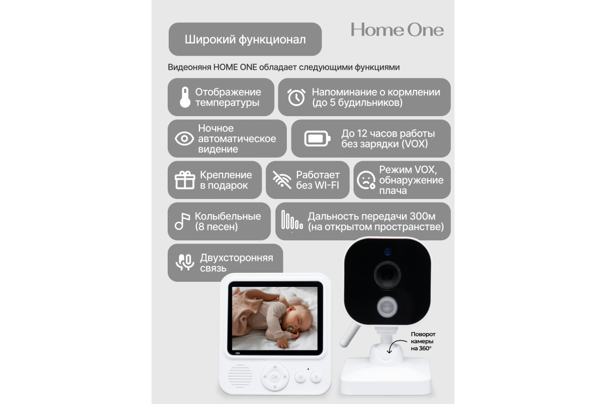 Кроме того, радионяня с камерой оснащена датчиком контроля температуры и звука в помещении, а возможность двусторонней голосовой связи позволит успокоить малыша на расстоянии.