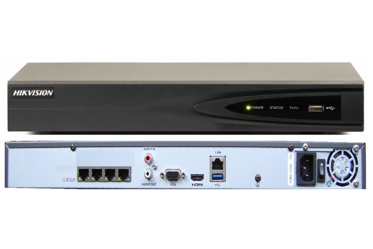 Видеорегистратор Hikvision DS-7604NI-K1/4P рассчитан на подключение до 4 сетевых видеокамер (с поддержкой их Smart функций) с разрешением до 8Мп. Суммарный битрейт — 40 Мбит/с. Модель оснащена видеовыходами (один независимый) 1×VGA, 1×HDMI (для трансляции сигнала высокой четкости). Разрешение вывода: HDMI — до 4K, VGA — до 2Мп. Интерфейсы: 2×USB 2.0, сетевой порт RJ-45, аудиовход/выход. NVR оборудован 4 независимыми RJ-45, поддерживающими технологию Ethernet с подачей питания на расстояние до 300 м по кабелю категории 6 (cat. 6) и до 200–250 м по кабелю категории 5e (cat. 5e). Общий бюджет PoE — 40 Вт.