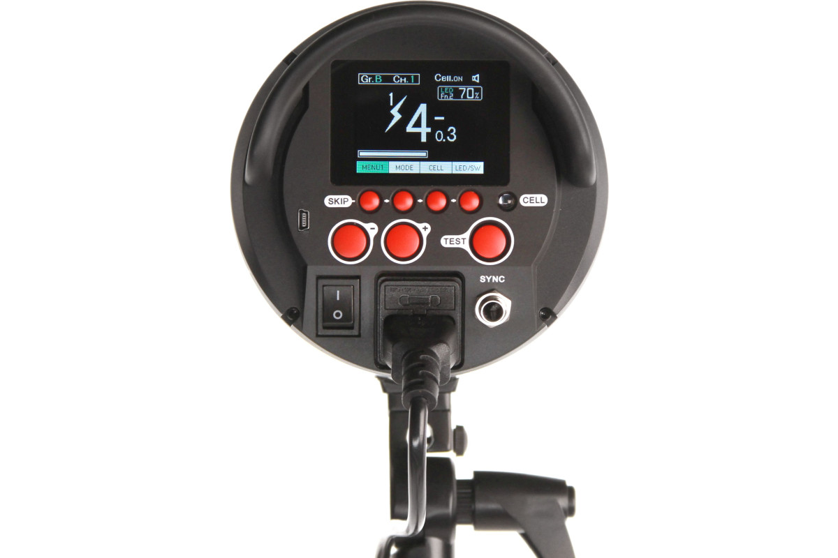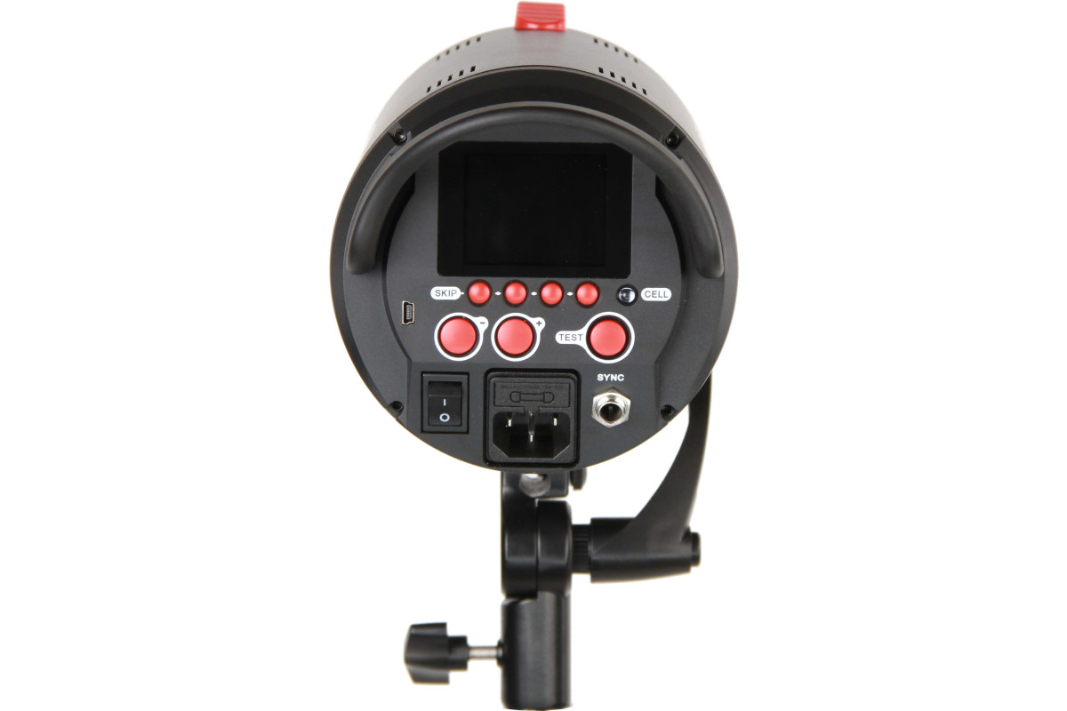 Панель управления расположена на задней стороне корпуса и состоит всего из 4 многофункциональных кнопок меню и 3 горячих кнопок большего размера – уменьшения мощности, увеличения мощности вспышки и кнопка «Тест». Установленные значения параметров и выбранный режим отображаются на большом ярком информативном дисплее.