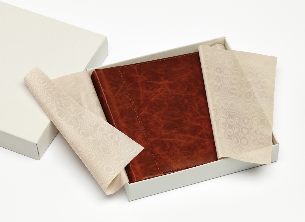 Традиционный альбом в книжном переплёте, с обложкой из высококачественной коричневой кожи, простроченной по периметру. Размер альбома: 32 x 32см, в альбоме 80 кремовых, не содержащих кислоты страниц и белые пергаминовые межстраничные листы. Альбом характеризуется корешком обложки, упрочнённым лентами, и бумагой ручного производства. Для крепления фотографий необходимы аксессуары ( стикеры , уголки, клей). В одном альбоме можно совмещать разные форматы фото.