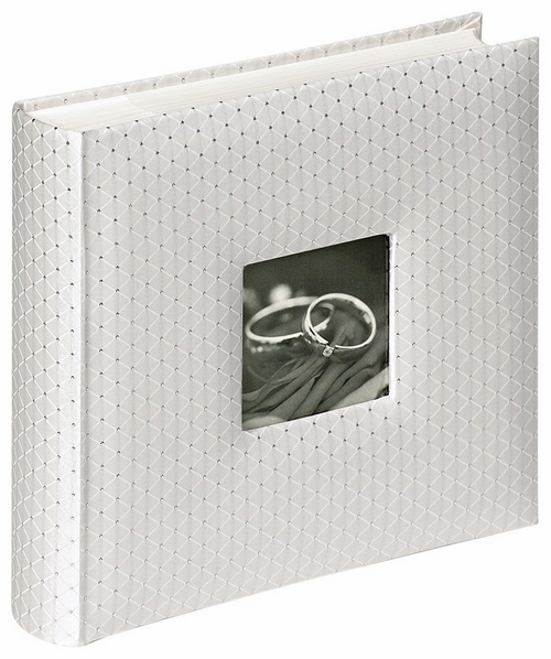 Свадебный альбом в книжном переплёте с кармашками. Высококачественная текстильная обложка с филигранными аппликациями в виде страз по всей поверхности. Кроме этого альбом украшен вырезом на лицевой стороне с фотографией колец (фото можно поменять). В альбом помещается 200 фотографий формата 10x15, есть поля для записей и место для хранения компакт-диска.
