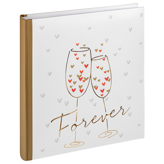 Традиционный свадебный альбом в книжном переплёте. Обложка из высококачественной ламинированной мелованной бумаги с золотистой тиснёной надписью ‘Forever‘ (англ.«Навсегда»). Кроме того, на обложке есть рисунок в виде двух бокалов для шампанского.