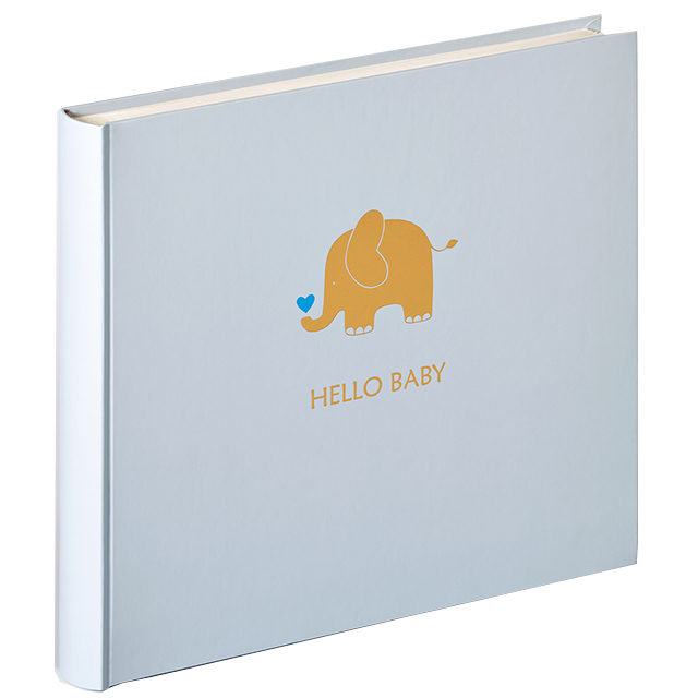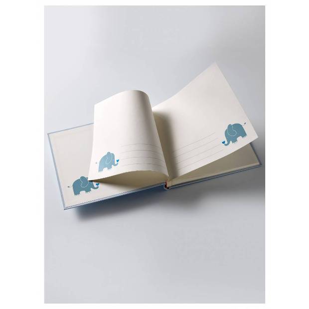 Традиционный детский альбом в книжном переплёте с обложкой из высококачественной ламинированной бумаги и золотистым тиснением в виде слоненка.