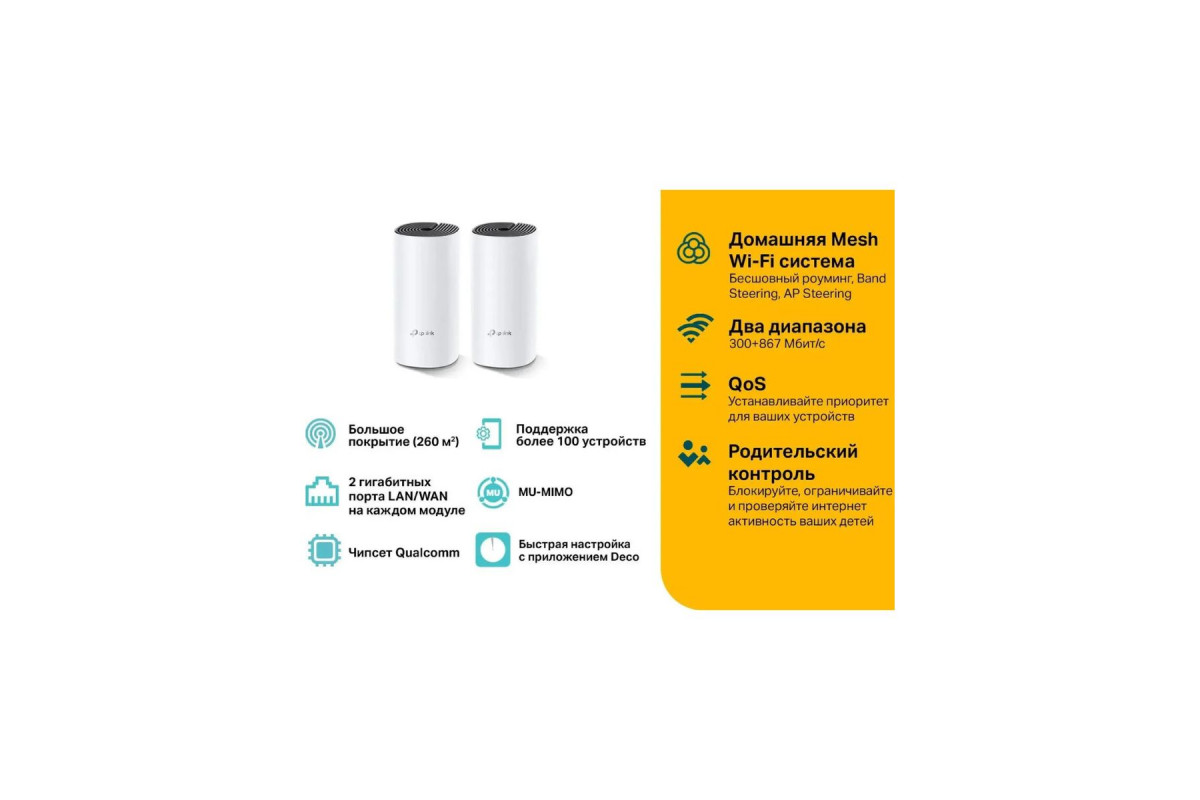 Mesh-системы TP-Link Deco M4 x2 призваны обеспечить высокоскоростной доступ к Интернету с пользовательских устройств в любом месте большого дома или приусадебного участка. Разместив эти роутеры беспроводной сети, поставляемые в количестве 2 шт., в оптимальных местах, вы сможете получить единую зону покрытия сети Wi-Fi. Точки доступа в цилиндрических белых корпусах поддерживают параллельную работу в диапазонах 2.4 и 5 ГГц и обеспечивают скорость соединения до 1167 МБит в сек по обоим диапазонам.