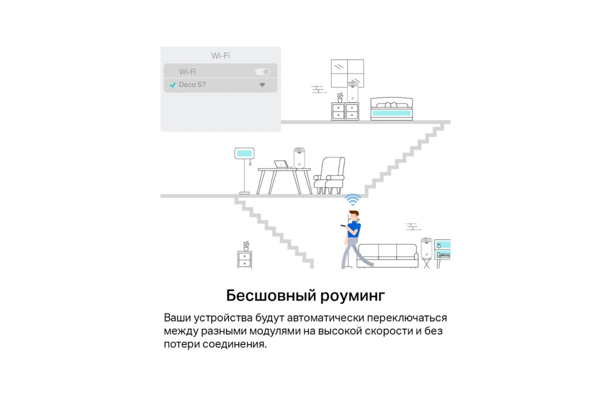 Deco S7 образует единую Mesh‑сеть с любыми другими устройствами Deco. Если нужно увеличить зону покрытия, просто добавьте в сеть больше модулей.