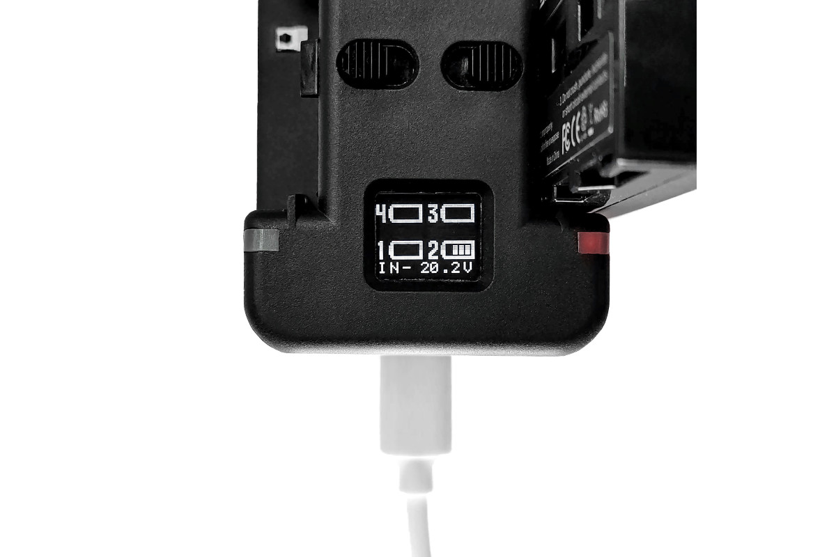 Яркий ЖК-дисплей и индикаторы на корпусе отображают статус и уровень заряда каждой батареи по отдельности. Время зарядки четырех аккумуляторов типа NP-F750 2 часа, NP-F970 – 4 часа.