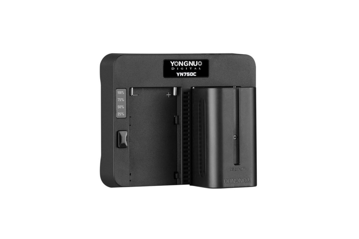 Зарядное устройство Yongnuo YN750C для зарядки двух аккумуляторов типа Sony NP-F. Имеет индикатор процесса заряда. Может заряжать аккумуляторы типов NP-F570, NP-F770, NP-F970.