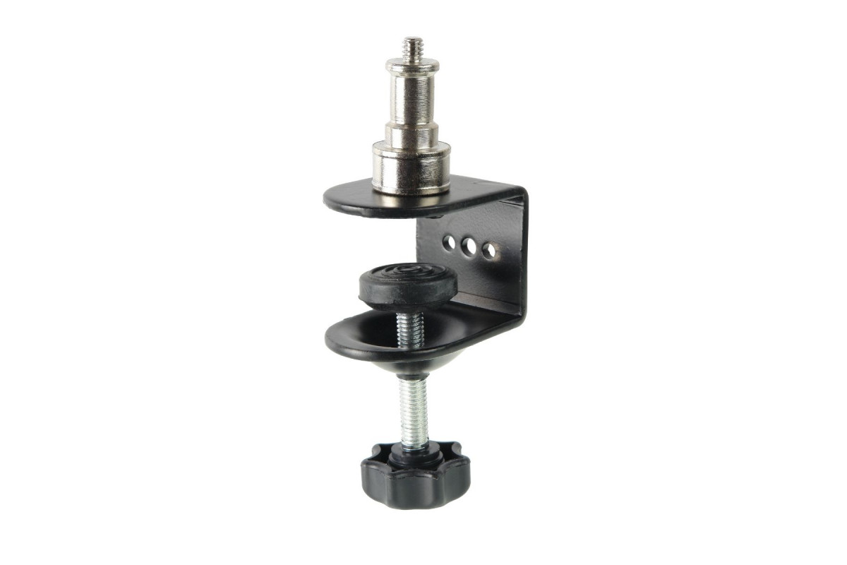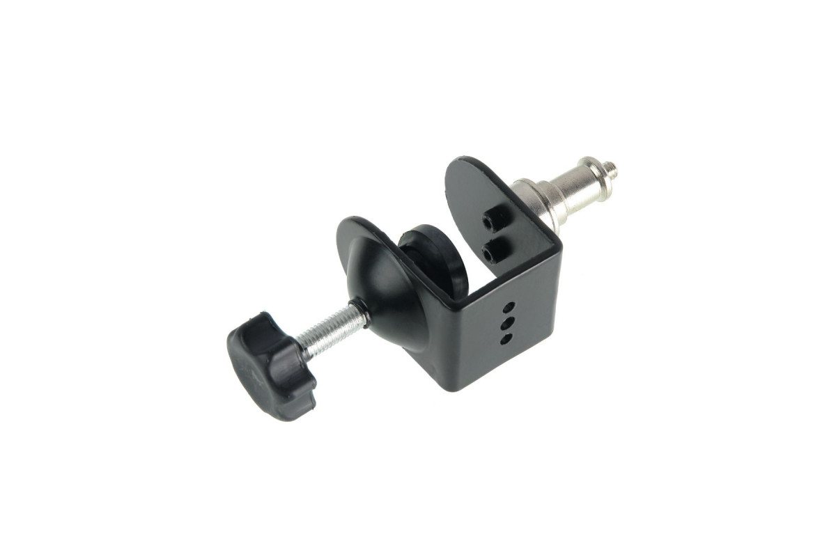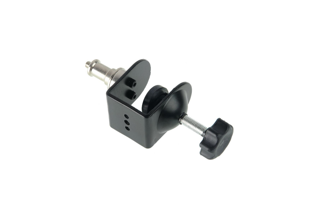 На конце зажима расположен шпигот 5/8" с посадочной резьбой 1/4" - на него устанавливается небольшой осветитель, вспышку, микрофон или любое другое студийное оборудование, имеющее соответствующее крепление.