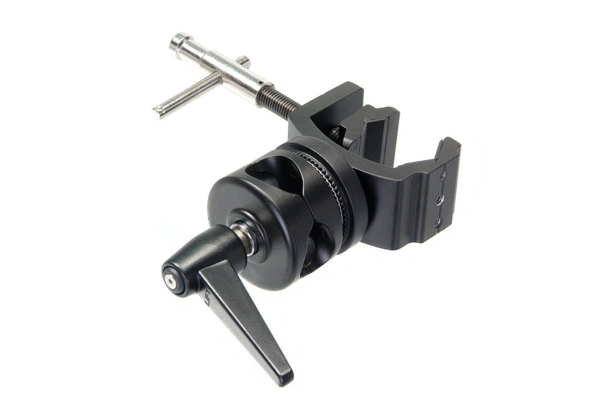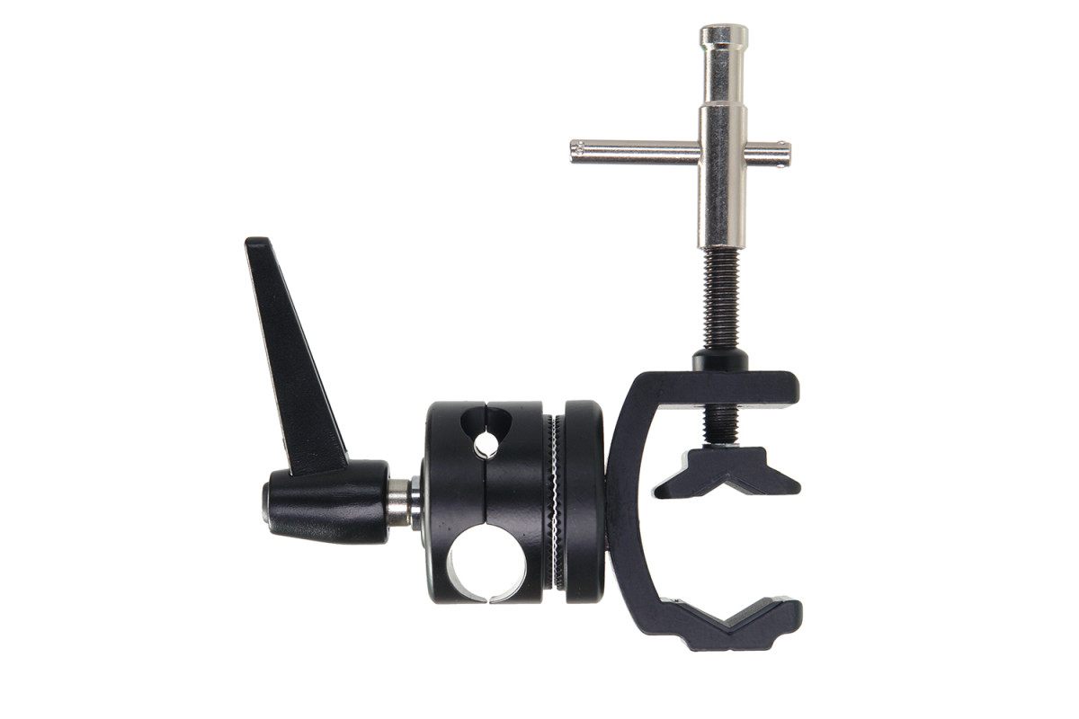 Зажим MegaClamp MC-038 с поворотной муфтой. Многофункциональный стальной зажим, предназначен для трех типов крепления: поворотная муфта для крепления перекладины (Ø 8 мм, 15 мм, 18 мм, 24 мм), струбцина для крепления на плоскость или трубу диаметром до 45 мм, шпилька 5/8".