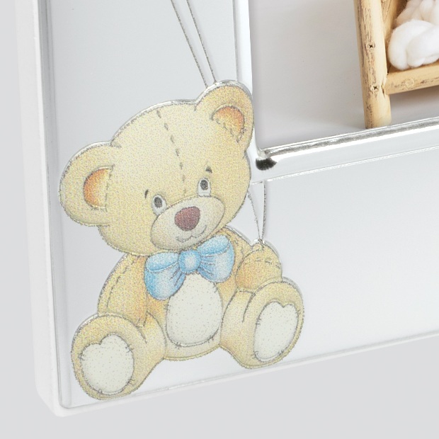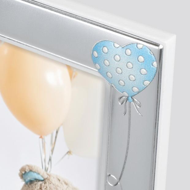 Фоторамка ZEP серия SILVER PLATED сделана в Италии из посеребренного алюминия. Для обработки поверхности используется напыление серебром. Такое покрытие характеризуется высокой прочностью и устойчивостью к окислению. Профиль рамки рельефно украшен мишкой и голубыми шарами. Задник рамки выполнен из дерева