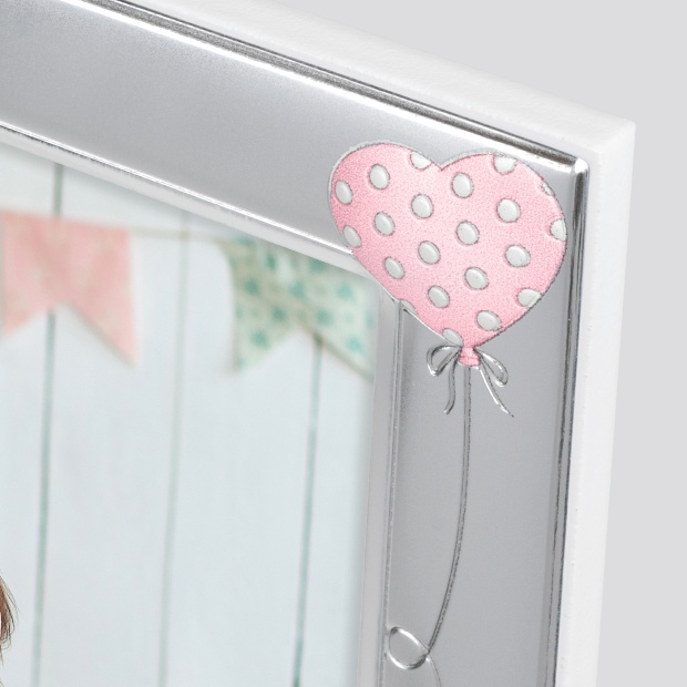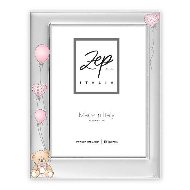Фоторамка ZEP серия SILVER PLATED сделана в Италии из посеребренного алюминия. Для обработки поверхности используется напыление серебром. Такое покрытие характеризуется высокой прочностью и устойчивостью к окислению. Профиль рамки рельефно украшен мишкой и розовыми шарами. Задник рамки выполнен из дерева