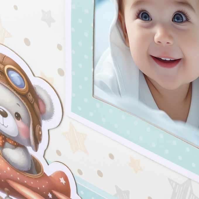 Традиционный детский альбом в книжном переплёте с обложкой из высококачественной ламинированной мелованной бумаги,с аппликацией в виде мишки с шариками. На лицевой стороне обложки есть вырез для личной фотографии. Размер альбома: 32x32 см, в альбоме 60 белых, не содержащих кислоты страниц, белые пергаминовые межстраничные листы,1 иллюстрированная нейтральная страница для записей. Для крепления фотографий необходимы аксессуары ( стикеры , уголки, клей). В одном альбоме можно совмещать разные форматы фото. Альбом упакован в коробку.