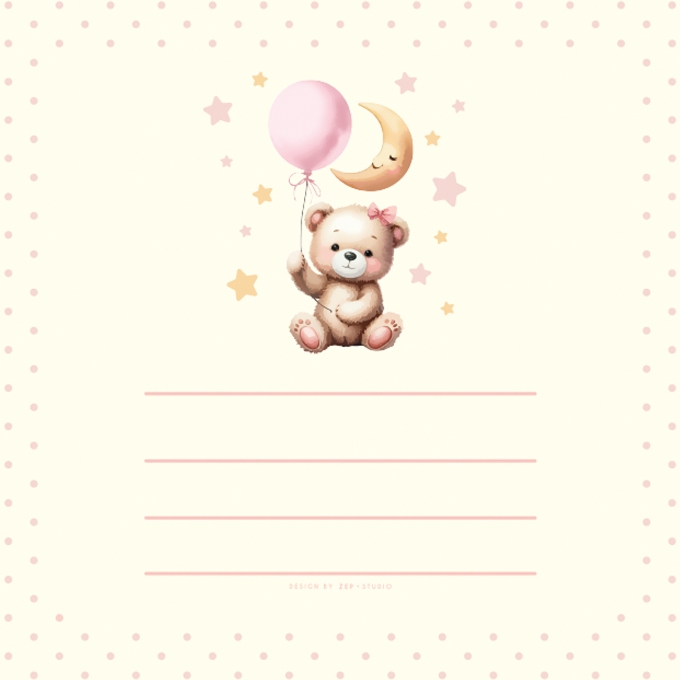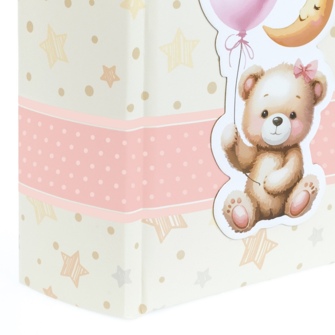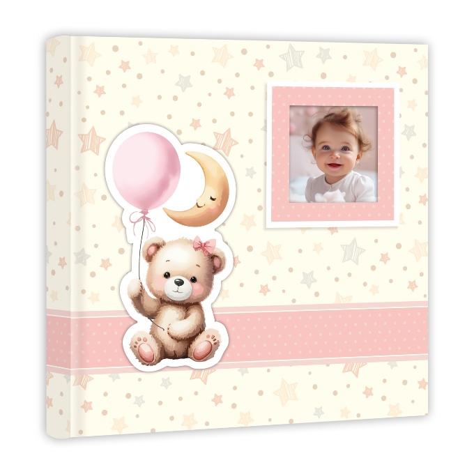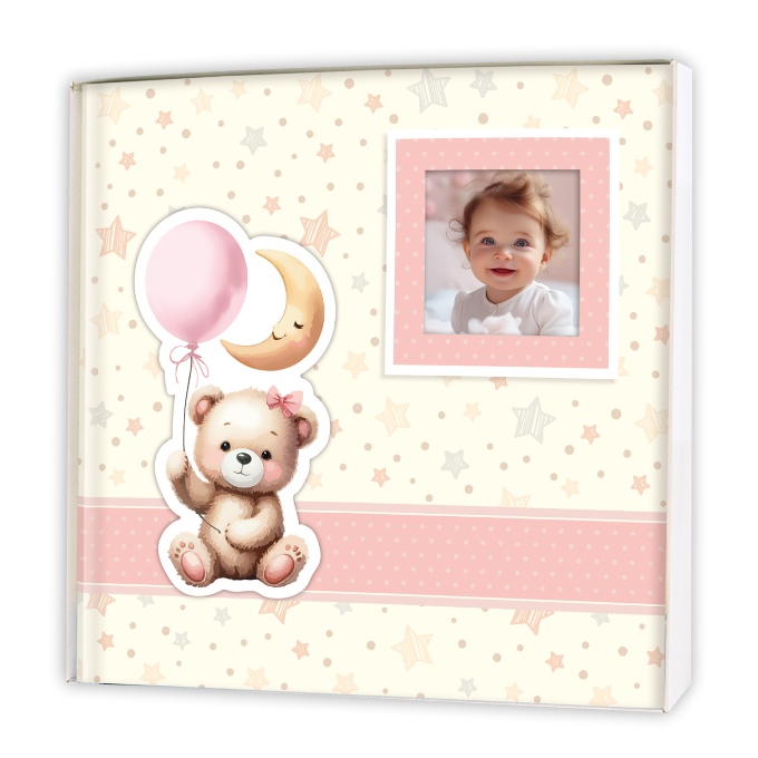 Традиционный детский альбом в книжном переплёте с обложкой из высококачественной ламинированной мелованной бумаги с аппликацией в виде мишки с шариками. На лицевой стороне обложки есть вырез для личной фотографии. Размер альбома: 32x32 см, в альбоме 60 белых, не содержащих кислоты страниц, белые пергаминовые межстраничные листы,1 иллюстрированная нейтральная страница для записей. Для крепления фотографий необходимы аксессуары ( стикеры , уголки, клей). В одном альбоме можно совмещать разные форматы фото. Альбом упакован в коробку.