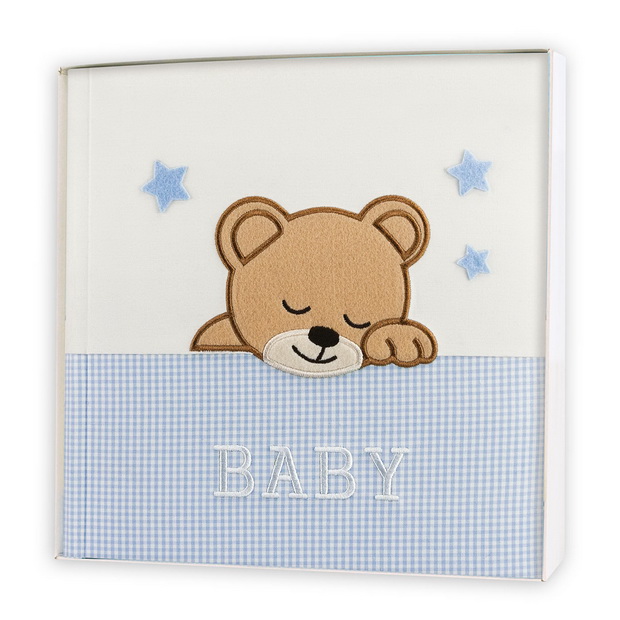 Традиционный детский альбом в книжном переплёте с текстильной обложкой и аппликацией в виде мишки и звездочек. Размер альбома: 24x24 см, в альбоме 40 белых, не содержащих кислоты страниц, белые пергаминовые межстраничные листы. Есть одна иллюстрированная страница для записи. Для крепления фотографий необходимы аксессуары ( стикеры, уголки, клей). В одном альбоме можно совмещать разные форматы фото. Альбом упакован в коробку.