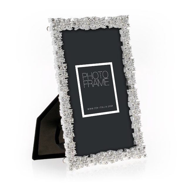 Металлическая рамка ZEP Rossini имеет глянцевую отделку, украшена стразами в форме цветка, выполнена в элегантном классическом стиле. У рамки бархатная спинка с ножкой для установки на поверхность. Упакована в коробку.