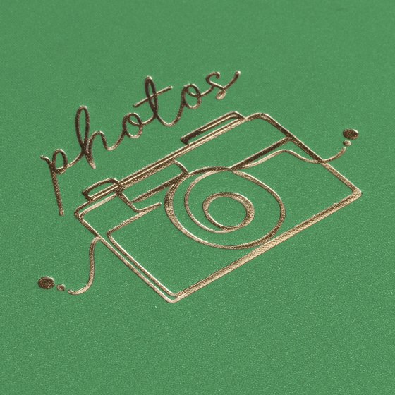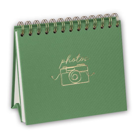 Магнитный фотоальбом ZEP Oliver с металлической спиралью золотистого цвета. У него бумажная обложка с тиснением золотом в виде фотоаппарата и надписью "photos". Устанавливается на стол.
