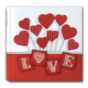 Традиционный альбом в книжном переплёте с обложкой из ламинированной бумаги. Размер альбома: 32x32см, в альбоме 40 белых, не содержащих кислоты страниц, белые пергаминовые межстраничные листы. Имеет 1 ил.стр.с принтом в виде сердечек. Для крепления фотографий необходимы аксессуары (стикеры, уголки, клей). В одном альбоме можно совмещать разные форматы фото. Альбом упакован в коробку красного цвета.